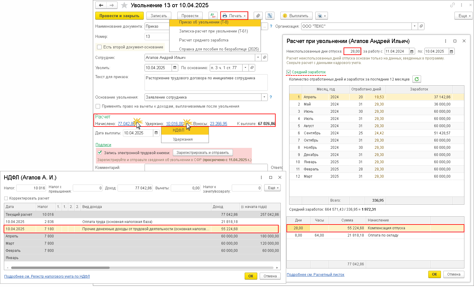 - По кнопке Печать можно получить печатную форму приказа об увольнении по унифицированной форме № Т-8, записку-расчет при увольнении (Т-61), расчет среднего заработка и справку для пособия по безработице.
