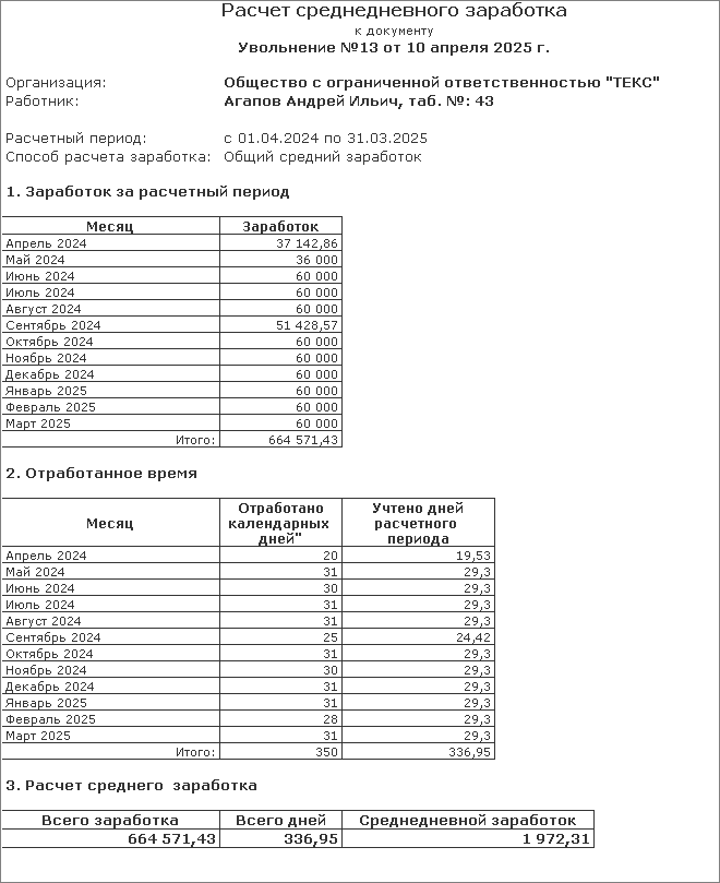 Среднедневной заработок равен: 664 571,43 руб. / 336,95 дн. = 1 972,31 руб.