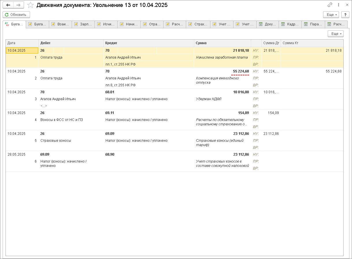 Для просмотра результата проведения документа нажмите кнопку Показать проводки и другие движения документа. По кнопке Выплатить можно сформировать комплект документов на выплату.